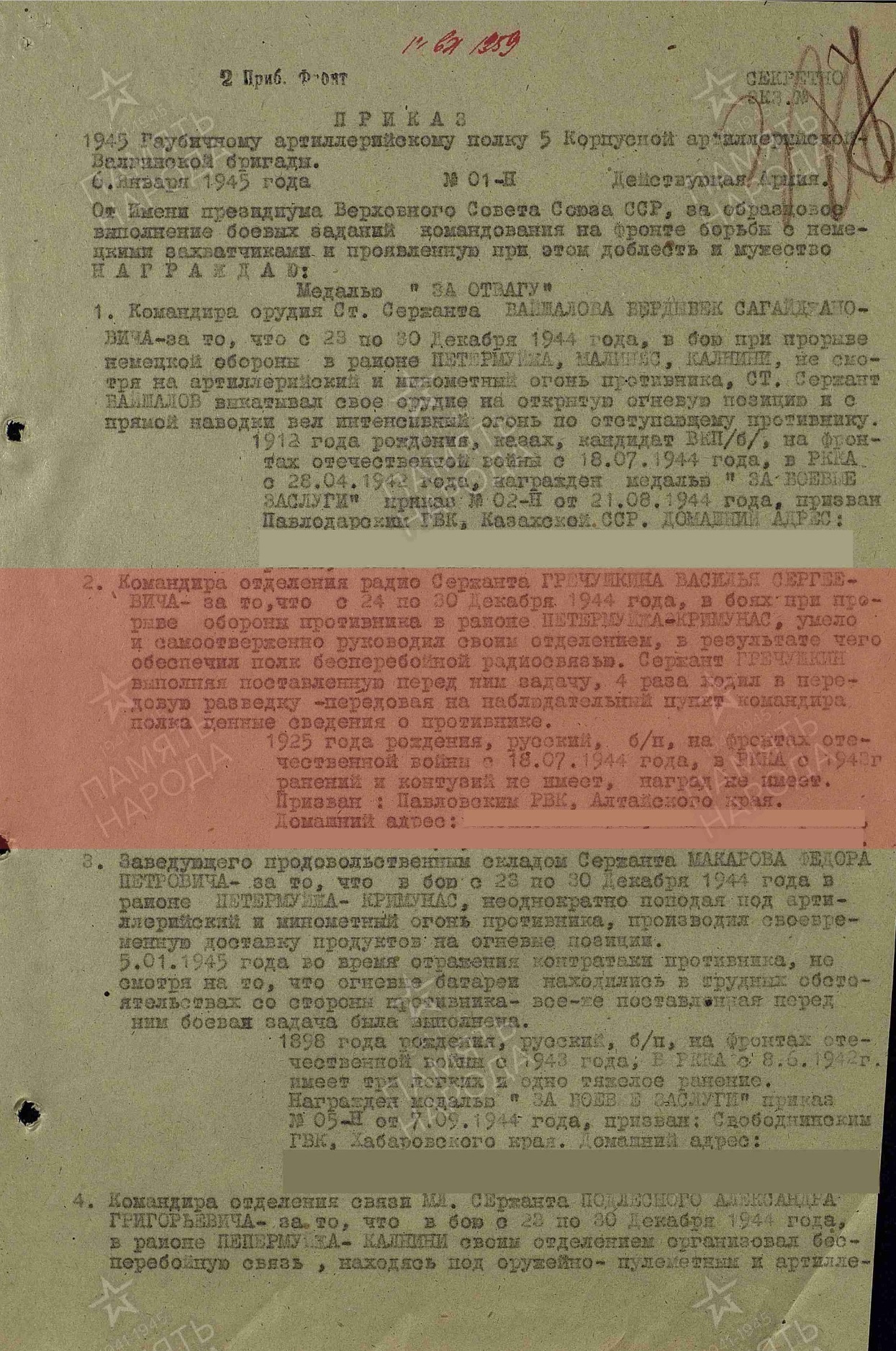 с 18 июля 1944 года, был командиром отделения радио 1945 гаубичного